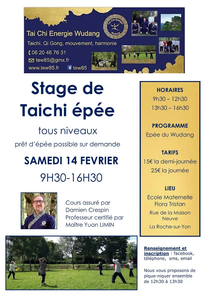 Voici les informations pour le prochain stage qui aura lieu le samedi 14 février et qui sera consacré à l'épée du Wudang.